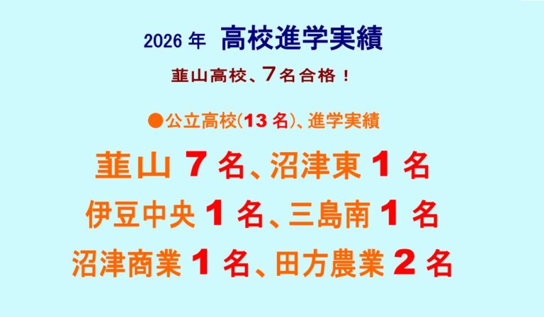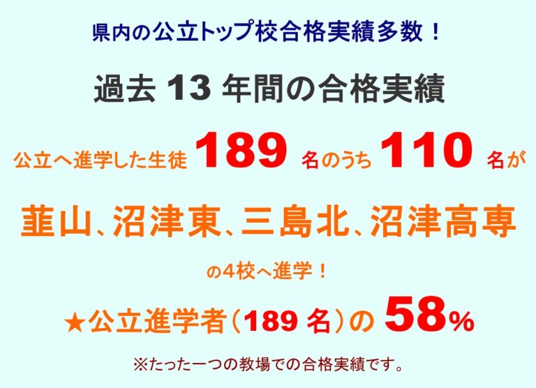公立進学189名中、110名(58%)が韮山(67名)・沼東(14名)・三北(20名)・高専(9名)へ!(過去13年間)