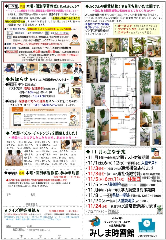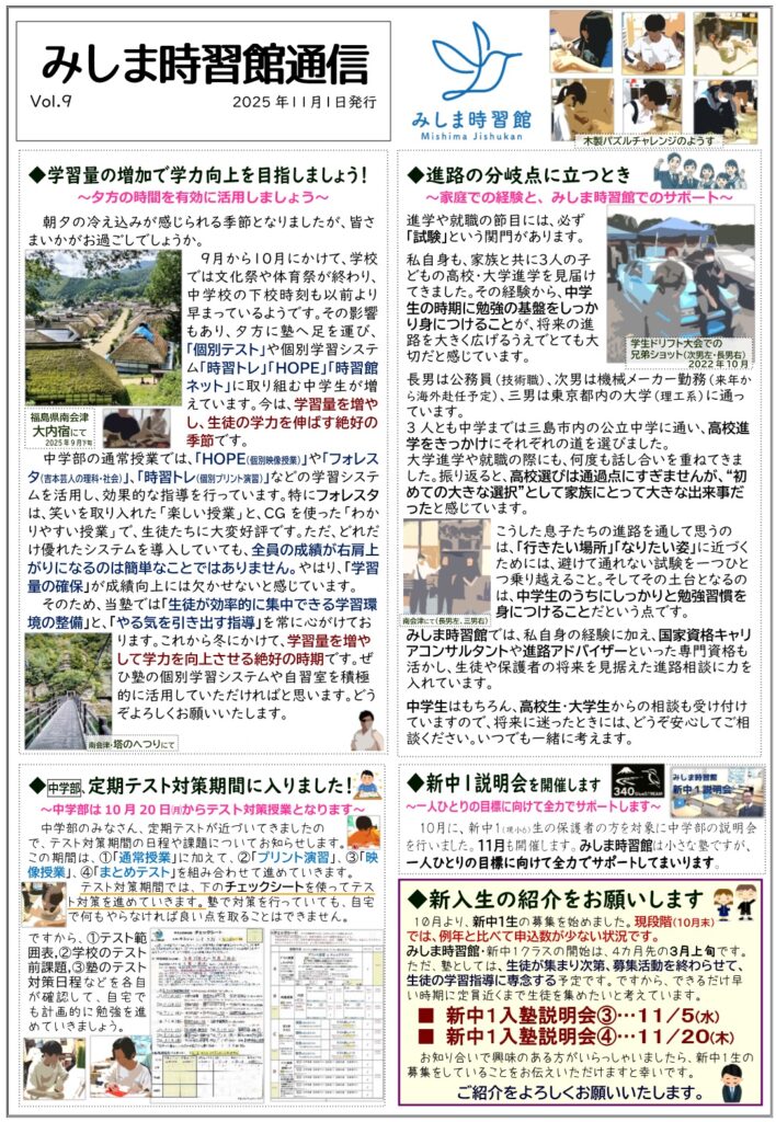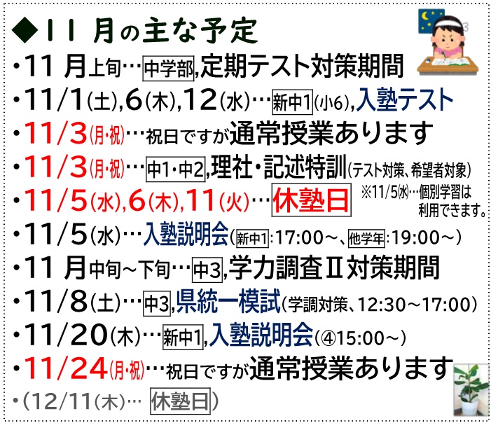そのため、当塾では「生徒が効率的に集中できる学習環境の整備」と、「やる気を引き出す指導」を常に心がけております。これから冬にかけて、学習量を増やして学力を向上させる絶好の時期です。ぜひ塾の個別学習システムや自習室を積極的に活用していただければと思います。どうぞよろしくお願いいたします。