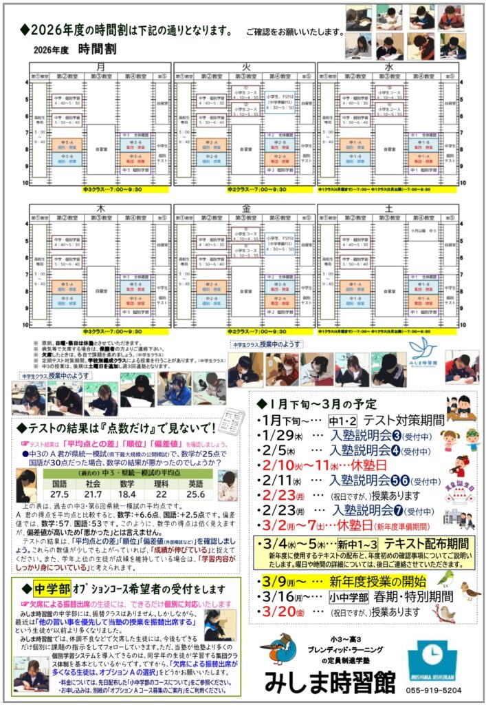 新年度に向けて、みしま時習館の指導体制が決まりましたのでお知らせします。小学生の算数と国語は、「ガウディア」と「自立学習」の2コースをご用意しております。中学部は、「対面による集団授業」と「個別のeラーニング」を組み合わせた「ブレンド型授業」が12年目を迎えます。この仕組みにより、みしま時習館の学習環境をさらに充実させ、より一人ひとりに合わせた学習が可能となっています。今後も、より質の高い学習指導ができるよう、工夫を重ねてまいります。